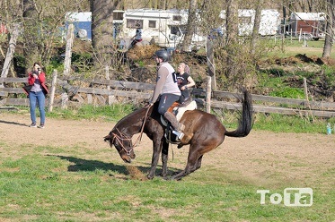 "Džouíno", jak mu říkáme, na rozdíl od ostatních kopytních případů kulhal už jako hříbě. Ne tedy, že by pod maminkou hopsalo třínohé hříbě, ale ve druhém roce jsem zaznamenala občasnou nepravidelnost, která mizela s příchodem veterináře. Fyzioterapie byla tehdy ještě v plenkách, takže jsme usoudili, že ho obsedneme a uvidíme, co se vyklube. Vyklubalo se něco úplně jiného, Joe byl v podstatě neobsednutelný. Začli jsme standardně ve 4 letech, já měla těhotenské břicho, ale tak jako tak bych s ním pracovala ze země a "lezl" na něj můj manžel. Skončilo to drobným polámáním bederních obratlů. Upozorňuji, že nejsem žádnej čočkař, jezdila jsem na stovkách koní, desítky jich obsedla, pracovala jsem s problémovými koňmi, kteří měli namířeno na jatka..všechny jsem zvládla tak, aby je ujezdili i ne úplně pokročilí jezdci a o všech vím, kde skončili a slouží dobře svým majitelům. Joe se samozřejmě "nějak" obsednout dal, ale vadil mi ten úzkostný výraz,který mu zůstával v očích..bylo načase obrátit se na skutečného zaříkávače. Záměrně neříkám horseman, protože horsemanem se v době, kdy k nám horsemanship doputoval, stal každý, kdo se uměl ohánět mrkvovou hůlkou a jestliže zvládnout Pareliho osm nebo, kolik že jich je - her, má být horsemanship, nepoužívám tento výraz pro to, co jsem hledala. První pokus se moc nevyvedl, pak jsme zjistili, že máme za rohem Freda Bednáře. Je mi úplně jedno, co si kdo o jeho práci myslí, důležité je, že nás skutečně naučil s našimi koňmi hovořit pro ně srozumitelným jazykem. Dnes už se naše cesty rozdělily, ale jak už jsem psala v příběhu o Johance, právě on- respektive jeho partnerka Tereza Lišková, nám kromě jiných věcí otevřeli oči hlavně stran stavu kopýtek. Nicméně, jelikož Joe je narozen ve znamení Lva,byla kombinace nezkrotnosti s jeho přecitlivělostí a výbušností fakt oříšek. Jirka si ho díky Fredovo učení obsedl sám, v kruhovce, na parelce, ale trvalo to rok. Jakékoliv "posunutí hranic" vyžaduje u Joa násobně víc času a trpělivosti, než jak jsme u koní zvyklí. Zmíním např. fakt, že už si "nechal" Jirku na hřbetě ve všech chodech, mohl na něm klidně dělat kotrmelce - do momentu, kdy se dostavil další neznámý člověk, a chtěl se na to podívat. Následoval výbuch "před ním tě vozit nebudu" a před dalšími zlomeninami Jirku zachraňovalo jen to, že bez sedla se padá bezpečněji, než se sedlem..